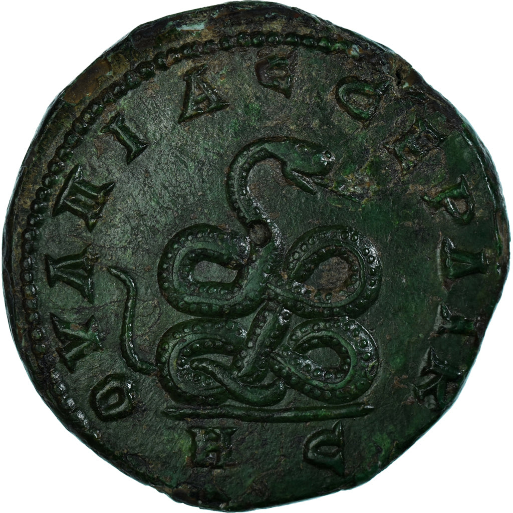 Testa laureata di Caracalla, a destra. Serpente arrotolato con testa a destra. Splendida patina di un verde smeraldo uniforme. Magnifico esemplare, probabilmente il migliore conosciuto per questo tipo. I fori centrali, che servivano a stabilizzare e centrare il flan prima della battuta, sono appena percettibili e hanno contribuito a rendere possibile questa magnifica battuta ben centrata. Ruzicka 359; AMNG 256. Ex Naville Numismatics 45, 2018, lotto 146.AYT K M AYP CEY H ANTΩNEINOCOYΛΠIAC CEPΔΙΚ//HC17.86 gr
